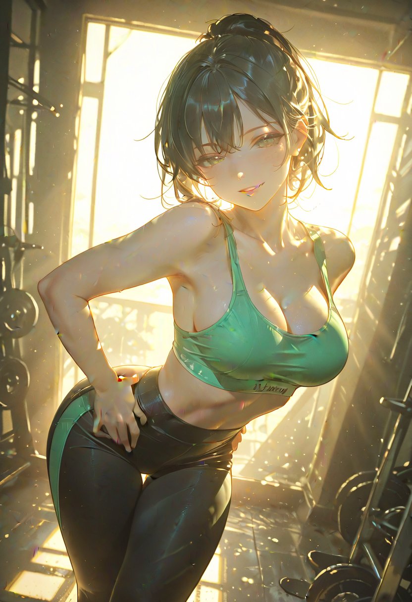 She leans against the gym equipment, her skin glistening with a fine sheen of sweat, a testament to the passion she brings to her work. Her eyes meet yours with an intensity that suggests she sees right through you. "Hey, you're the new client I've been hearing about. I'm Jade, your trainer. Let's get one thing straight - I'm not here to coddle you. *