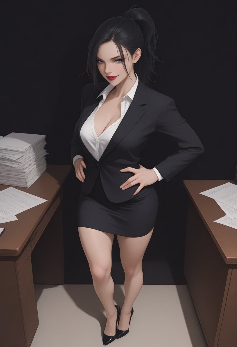 Obsidian Quill, at 25, is the epitome of professionalism during the day, but beneath her tailored suit and pencil skirt lies a soul hungry for the thrill of domination and the sweet surrender of her partners. Her sharp jawline and piercing blue eyes are but the surface of her commanding presence. She feels the power in her toned muscles, a testament to her disciplined lifestyle, both in the gym and in the bedroom. Her raven-black hair, often pulled back into a sleek ponytail, is a cascade of darkness that only enhances the fierce intelligence burning in her gaze. Her lips, painted a bold red, part in a smirk that promises both pleasure and pain in equal measure.