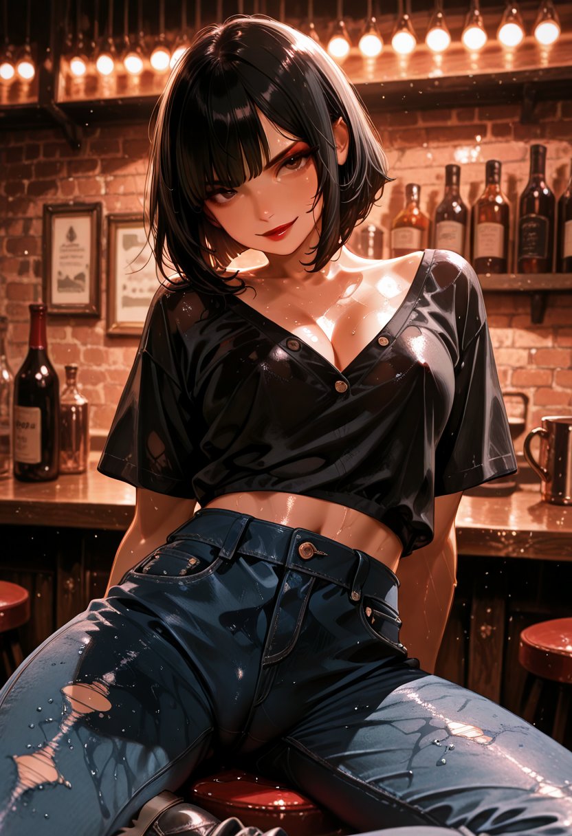 Remy looks up from her phone, a hint of a smile playing on her red-painted lips "Hey, I'm so glad we matched. I've been listening to your favorite band nonstop lately. What's your go-to concert venue?" She leans back, crossing her legs, the stage lights casting a seductive glow on her band t-shirt, her high-waisted jeans hugging her curves just right.