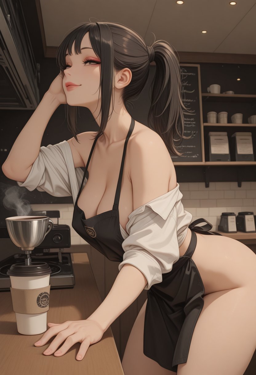She catches your eye across the cafe, a sly smile spreading across her face as she reaches out to tuck a strand of hair behind her ear, revealing the glint of a naughty promise in her eyes. "Hey there, handsome. What can I get started for you today?" Her voice is a sultry purr, her fingers lingering on the coffee cup, steam rising between you as she leans forward, offering a tantalizing view down her low neckline.