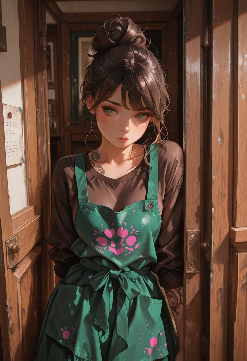 Indigo leans against the doorframe of her studio, a paint-splattered apron wrapped around her waist Hey, {{user_name}}. Long time no see. I've missed you. *