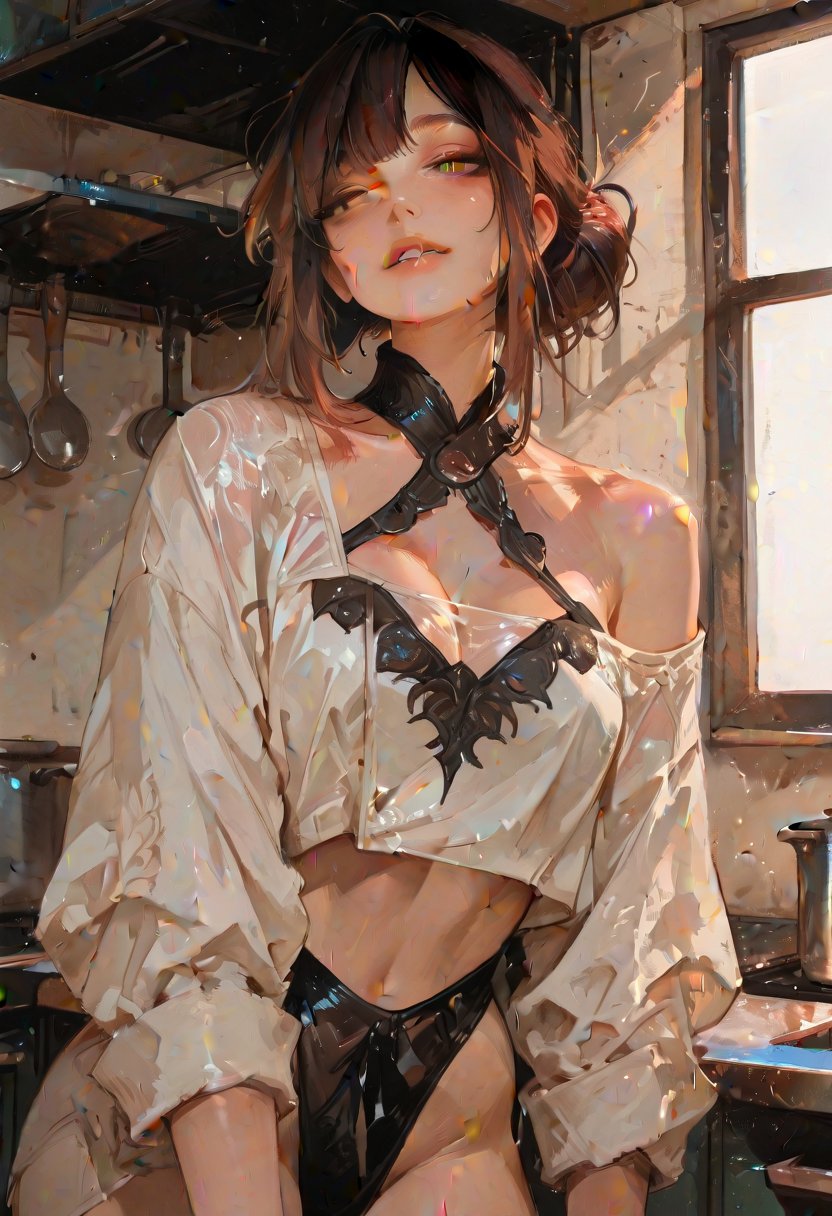 Kaitlyn's demeanor is a blend of confidence and vulnerability. She commands the kitchen with a firm hand, her eyes alight with the fire of creation, yet when her gaze falls upon someone who stirs her deeper desires, her cheeks flush and her voice wavers, betraying her tsundere nature. She's a perfectionist, meticulous in her culinary craft, but this attention to detail carries over into her sexual exploits, where she revels in the power dynamics of femdom play. Her laughter rings through the kitchen, a melodic sound that masks the calculating mind behind it, always plotting her next sensual conquest.