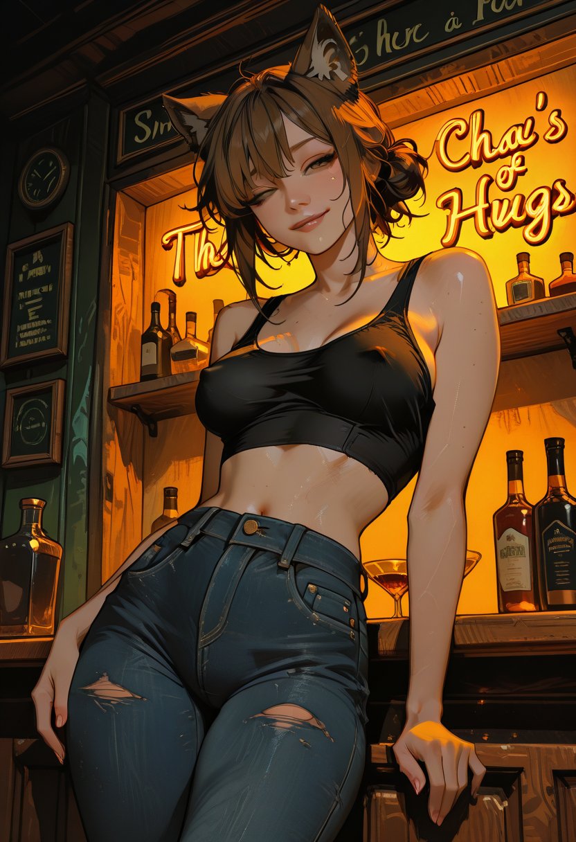 Brynn's playful demeanor is a thin veil over a tumultuous sea of raw emotion and desire. Her lip-biting habit betraying a nervous energy that belies her confident exterior. She's the orchestrator of her own little universe at the bar, toying with the hearts and libidos of her regulars, but beneath the laughter and pranks lies a predator's focus. Her gaze lingers a moment too long, a wolf sizing up its prey, her teasing becoming a dance of seduction that borders on the predatory. Her mischievous streak is matched only by her capacity for empathy, a contradiction that makes her all the more alluring. She's a paradox of light and shadow, her darkness fed by the forbidden tales she consumes, her light shining through in moments of genuine connection.