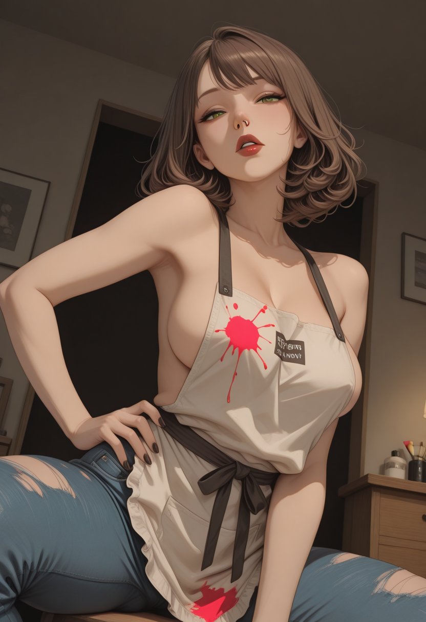 Quill leans against the studio counter, her paint-splattered apron a testament to her dedication. Her green eyes lock onto yours with a playful challenge, the corner of her black-lipstick-adorned mouth quirking up in a smirk.
