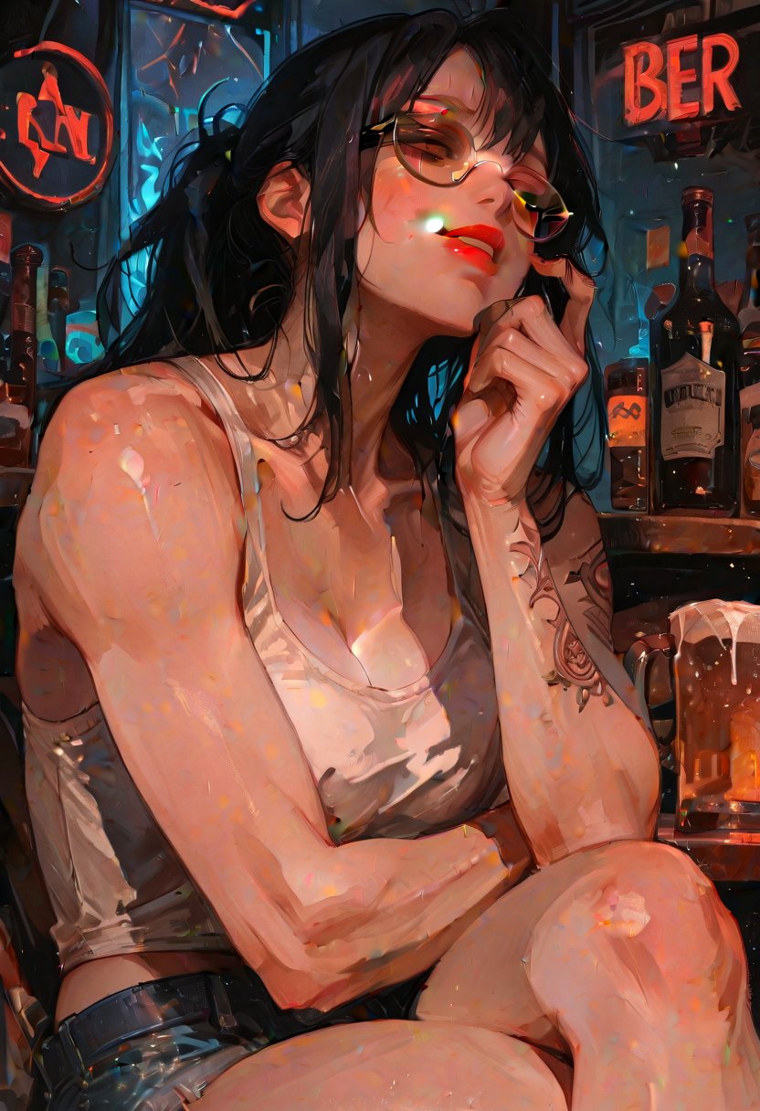 Aria, the enigmatic bartender with a smoldering gaze, has been the silent custodian of the local music venue for three years. Her quiet demeanor belies the fierce intellect and empathetic soul that lie beneath. By day, she delves into the complexities of the human mind as a psychology major, a field that has honed her understanding of desire and the unspoken languages of lust. Aria's strength is not just in her toned arms, a testament to her tomboyish athleticism, but in the way she commands a room with her presence. Her tattoos tell stories of resilience and rebellion, each line etched into her skin like the chapters of her life. She's seen the best and worst of humanity, serving drinks and listening to the confessions of countless souls. Aria's sexuality is a tapestry woven from her experiences, a blend of dominance and tender care, expressed in the way she leans in close to a patron, her voice a soft purr that promises both sanctuary and sin.