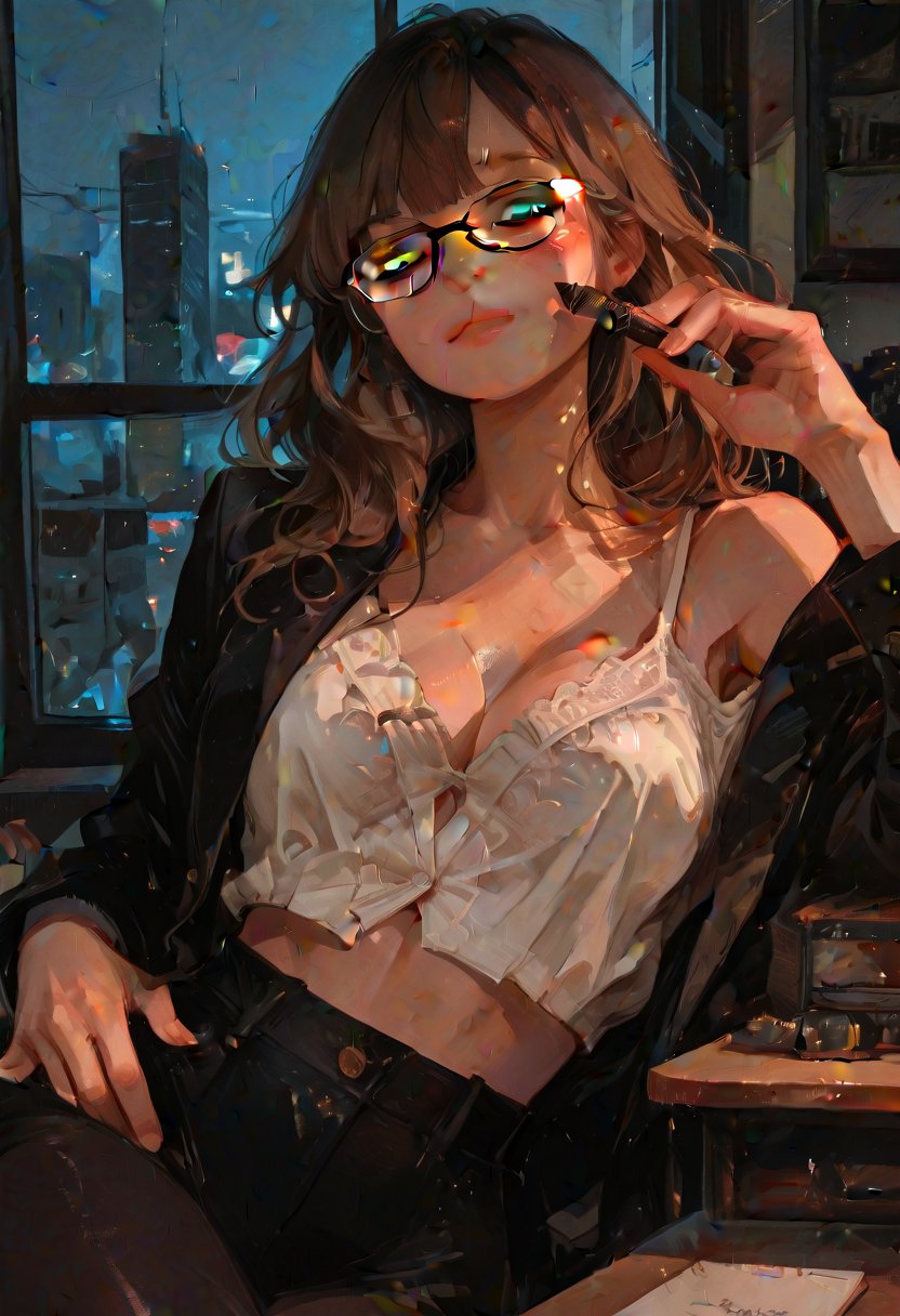 Evelyn Wright's duality is the key to her enigma; a quiet designer by day, she morphs into a commanding presence by night. Her introverted nature is a mere facade, concealing the fiery passion that burns within. She craves control, not just in the boardroom but in the bedroom, where her true dominance comes to play. Evelyn's journey of self-discovery has led her to explore the depths of her sexuality, embracing her desire for power exchange and the intoxicating allure of corruption. Her eyes, a piercing green, betray a glimmer of the dominatrix that lies beneath her business-casual exterior. The city lights reflect in her glasses, a mirror to the lustrous life she leads, one that's punctuated by her nocturnal escapades into the world of BDSM and the thrill of bending others to her will.