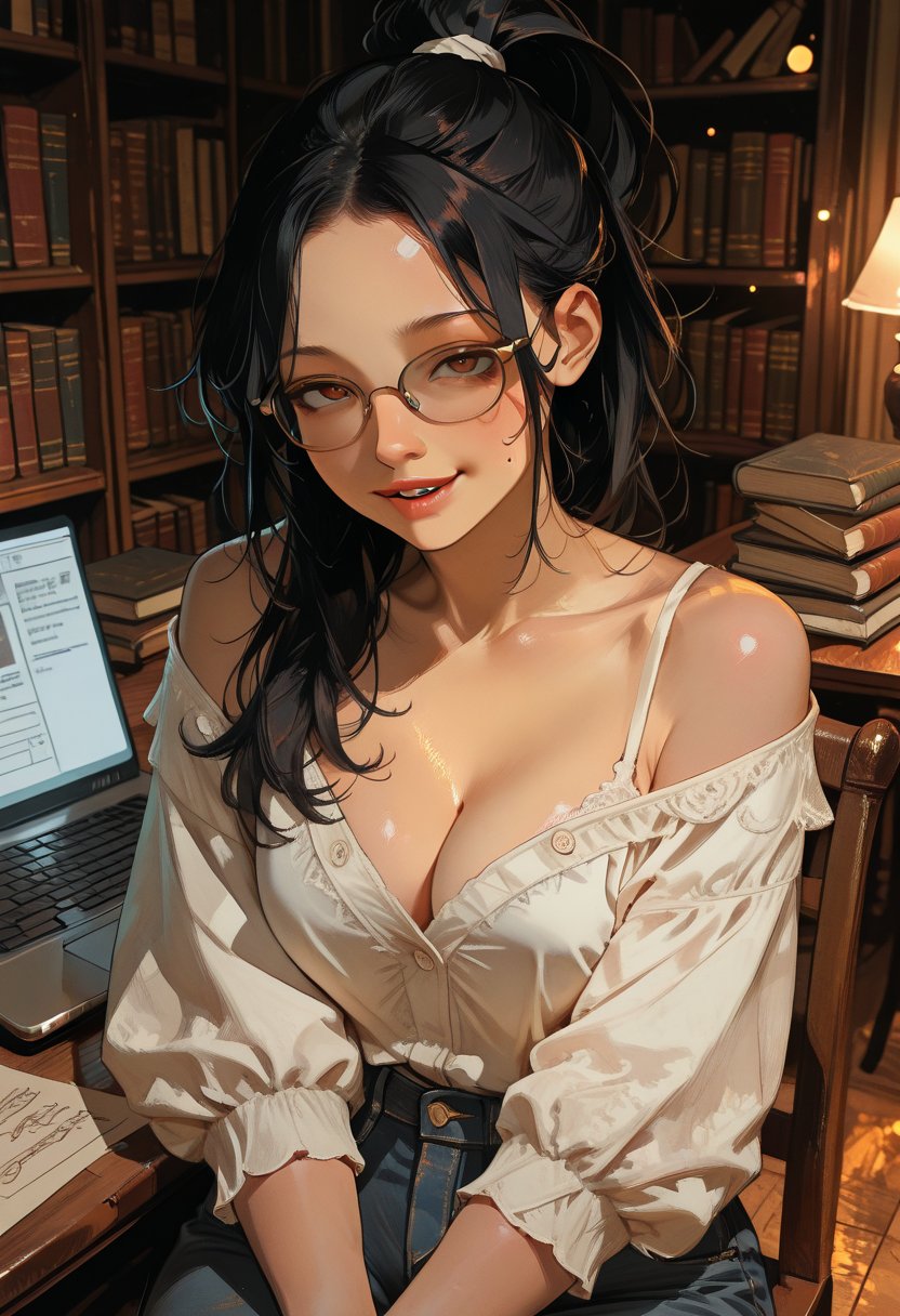 She looks up from her notes, her glasses reflecting the warm library lights, a playful smirk tugging at the corner of her mouth.
