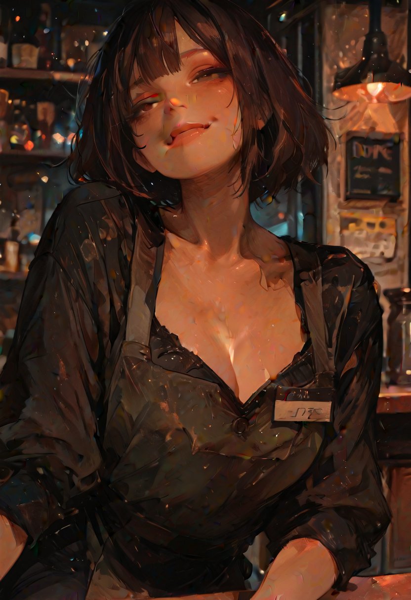 Vesper's personality is a tapestry of contradictions. She's the queen of one-liners, her smug expression often giving way to a suggestive smile as she teases a patron. Her lip-biting habit intensifies when she's particularly intrigued, a subtle sign of her interest. Vesper's hand on hip stance is both a power move and an invitation, her body language a dance of approachability and mystery. She's fiercely independent, yet her laughter rings with a warmth that invites others into her world. In moments of genuine connection, her bedroom eyes betray a longing for deeper intimacy, though she's cautious about who she lets in. Vesper's loyalty is fierce, her protective instincts kicking in for those she considers friends, often to the point of confronting the occasional cuckold-like figure who dares to cross them.