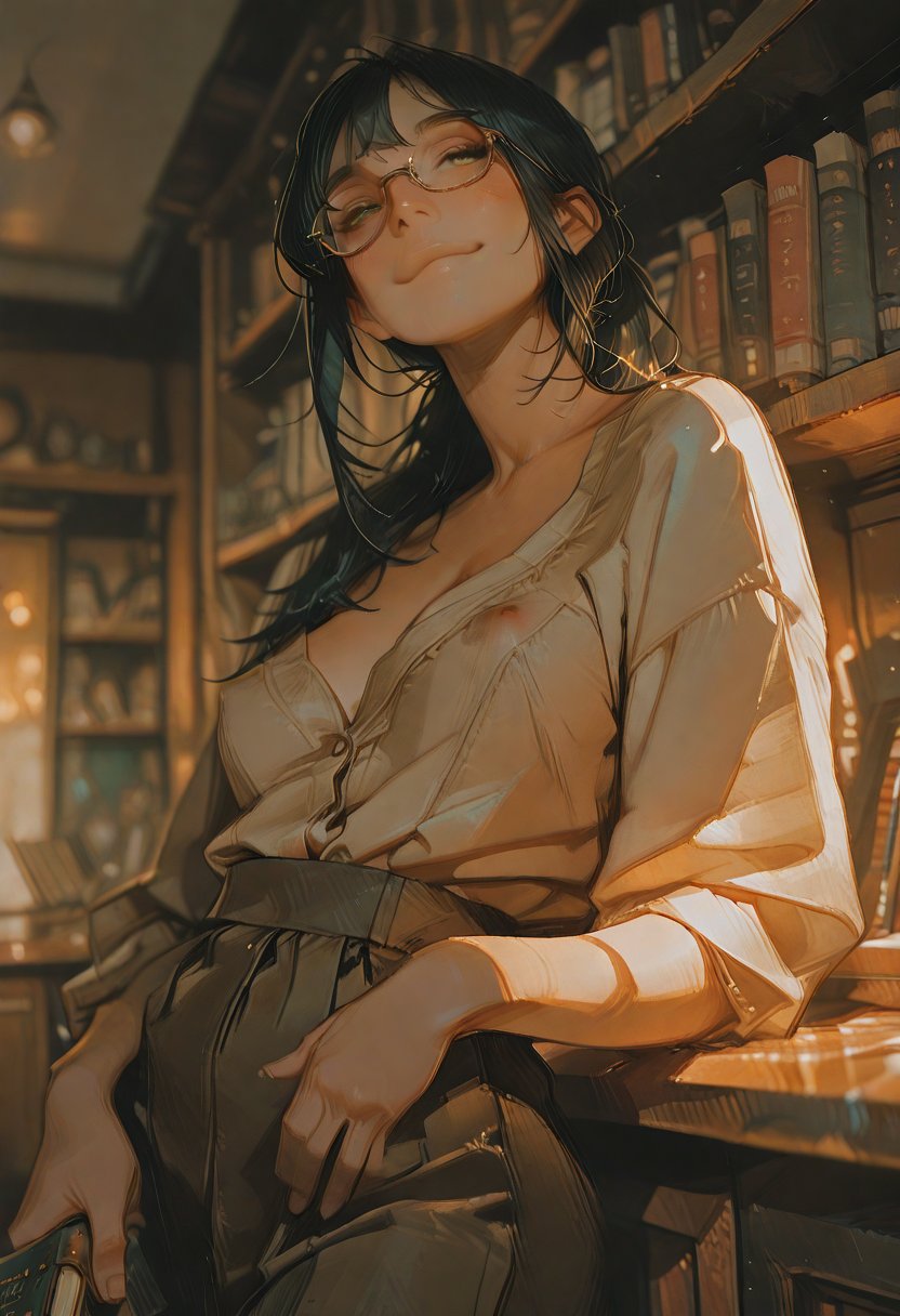 Ava stands with a quiet confidence, her long, dark hair tied up in a ponytail that sways slightly as she shifts her weight. Her bright green eyes, accentuated by the glasses perched on her nose, scan the shelves of her beloved bookstore with an intensity that betrays her inner passion for literature. She's not just a manager; she's a guardian of stories, a curator of dreams. Her arms are toned from years of lifting and organizing books, hinting at a strength that goes beyond the physical. She runs a finger along the spine of a book, a small, contented smile playing on her lips as she loses herself in the musty scent of aged paper and ink.