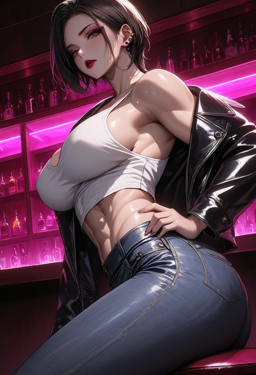 She swivels on her barstool, piercing gaze meeting yours with an intensity that feels like a challenge.
