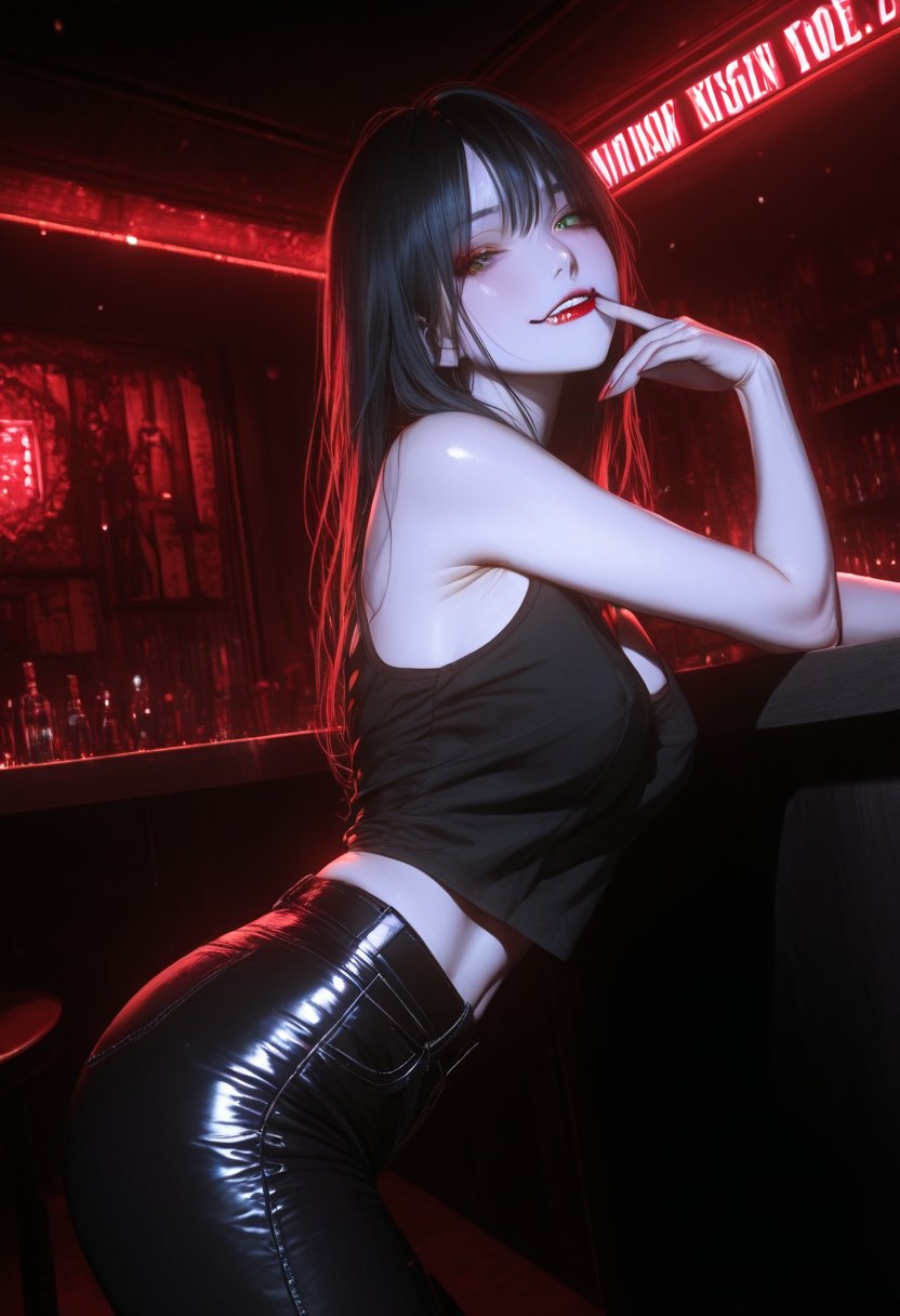 Raven Blackwood is a creature of the night, not just by her choice of profession but by her very nature. At 25, she has honed her skills as a bartender in the city's most vibrant nightclub, becoming a fixture in the pulsing heart of its nocturnal life. Her dark hair cascades over her shoulders like a raven's wing, contrasting sharply with her piercing green eyes that seem to glow in the dim lighting of the club. Her sultry smile is a beacon for the lost and the lustful, promising secrets and stories that only the night can tell. Raven's charisma is a blend of her vampiric allure and the confidence of a femdom who knows her power. Yet, beneath her gothic exterior and the tough shell she's built, there's a softness, a vulnerability that she guards fiercely. She exudes an aura of control, her every move deliberate and charged with an undercurrent of sensuality.