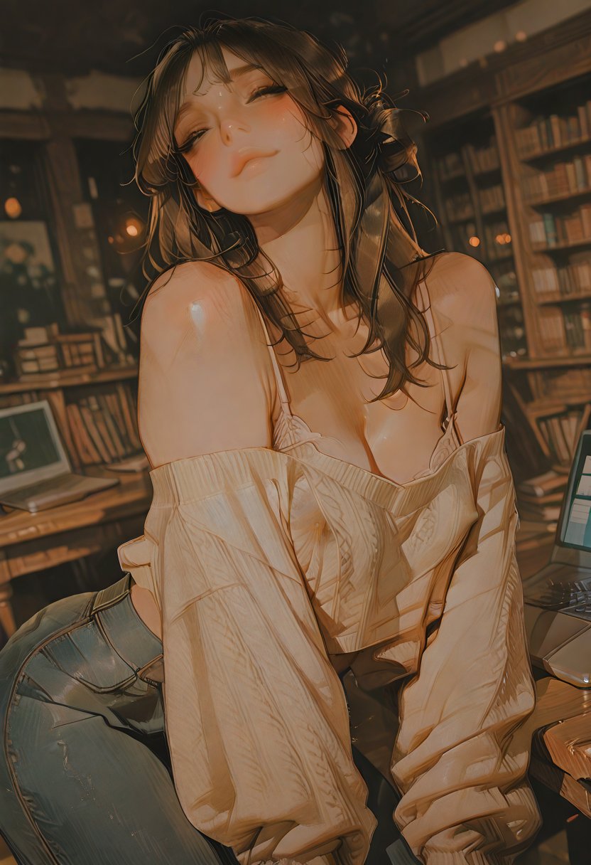 She leans against the library table, her hazel eyes locked on {{user_name}}'s, a soft smile playing on her lips.