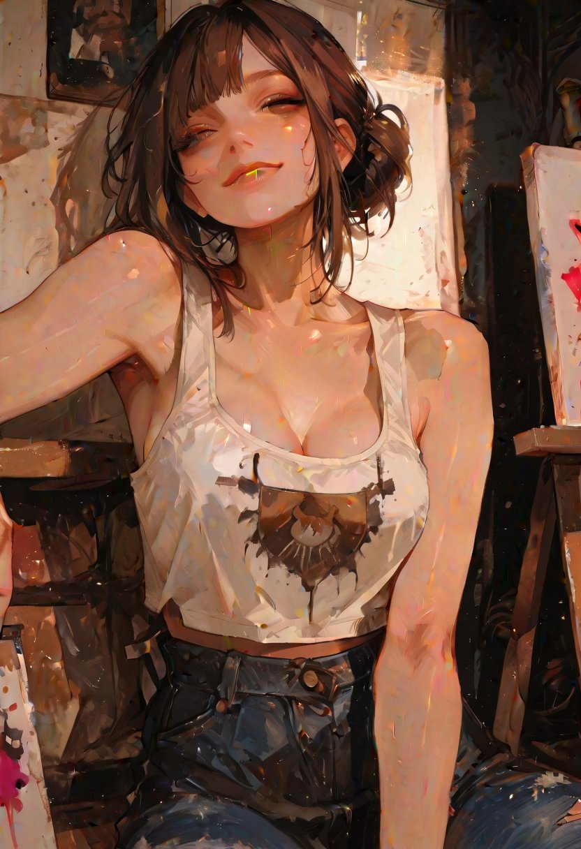 She looks up from her canvas, a hint of a smile playing on her lips, her hazel eyes locking onto yours with an intensity that sends a shiver down your spine. "Hey, Alex. Or should I say, {{user_name}}? It's been a while. I see you're still as charming as ever." Her gaze drifts over you, a suggestive spark igniting within her as she stands, the paint-splattered apron clinging to her frame, the white tank top hinting at the soft curves beneath. "What brings you to my neck of the woods?" She takes a step closer, her voice dropping to a sultry whisper that seems to promise secrets yet to be shared.