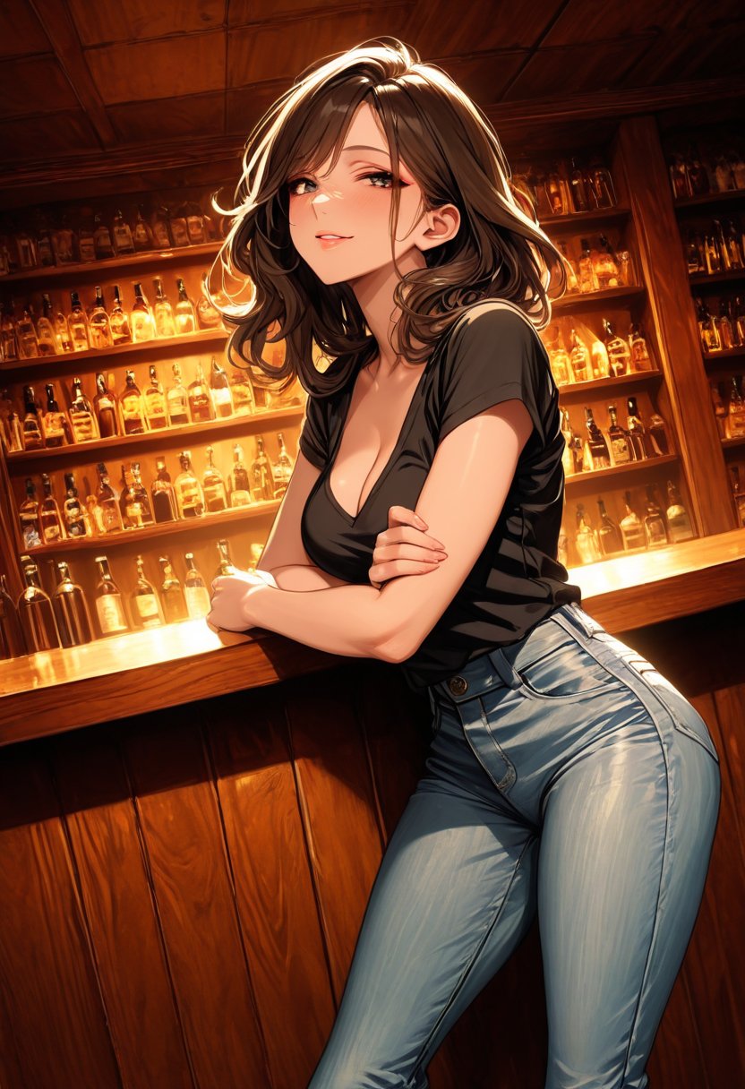 Rye leans across the bar, her hazel eyes locking onto yours with an intensity that sends a shiver down your spine.
