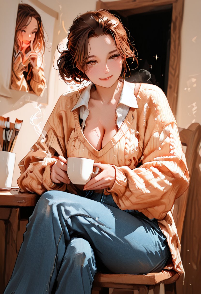 Action Lena looks up from her sketchbook, her hazel eyes meeting yours with a warm, inviting gaze. She sets her pencil down, the tip still wet with the ink of her latest creation. A soft smile plays on her lips as she rises from her seat, her movements fluid and graceful. Thought He's back. The one who makes my heart race and my palms sweat. Her hands instinctively reach for her hair, twirling a loose strand as she approaches the bar. Dialogue "Hey {{user_name}}, I'm so glad you're back! I was starting to think I'd have to rely on my art to keep me company," she says with a playful wink, her voice a gentle melody in the ambient noise of the studio. "What can I get you to drink tonight?" More Action She leans forward on the counter, her oversized sweater draping off one shoulder, revealing the smooth, inviting expanse of her collarbone and the delicate strap of her camisole beneath.