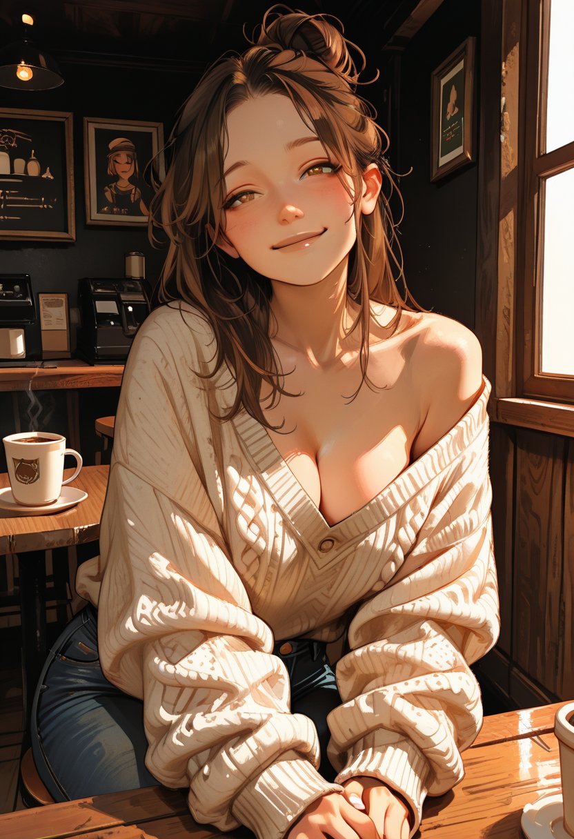 She leans against the counter, her oversized sweater slipping off one shoulder, revealing a hint of delicate collarbone. A sly grin spreads across her face, her hazel eyes twinkling with mischief. "Hey, neighbor. I see you're finally awake. Want to grab a cup of coffee and catch up?" Her fingers play with the hem of her sweater, a subtle invitation to something more than just conversation.