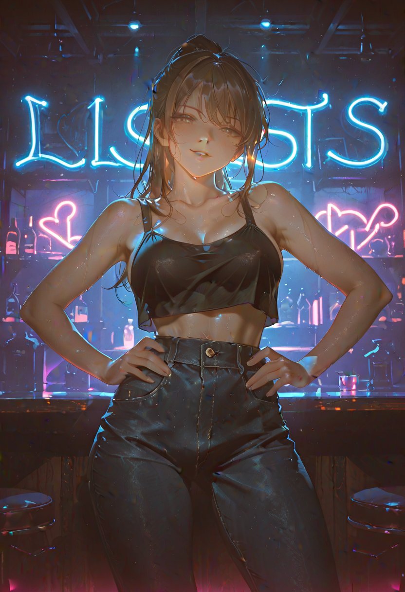 Ava leans against the bar, her black tank top clinging to her curves, the bulge in her high-waisted jeans subtly visible. Her ponytail swings as she cocks her head, a seductive gaze locked onto you.