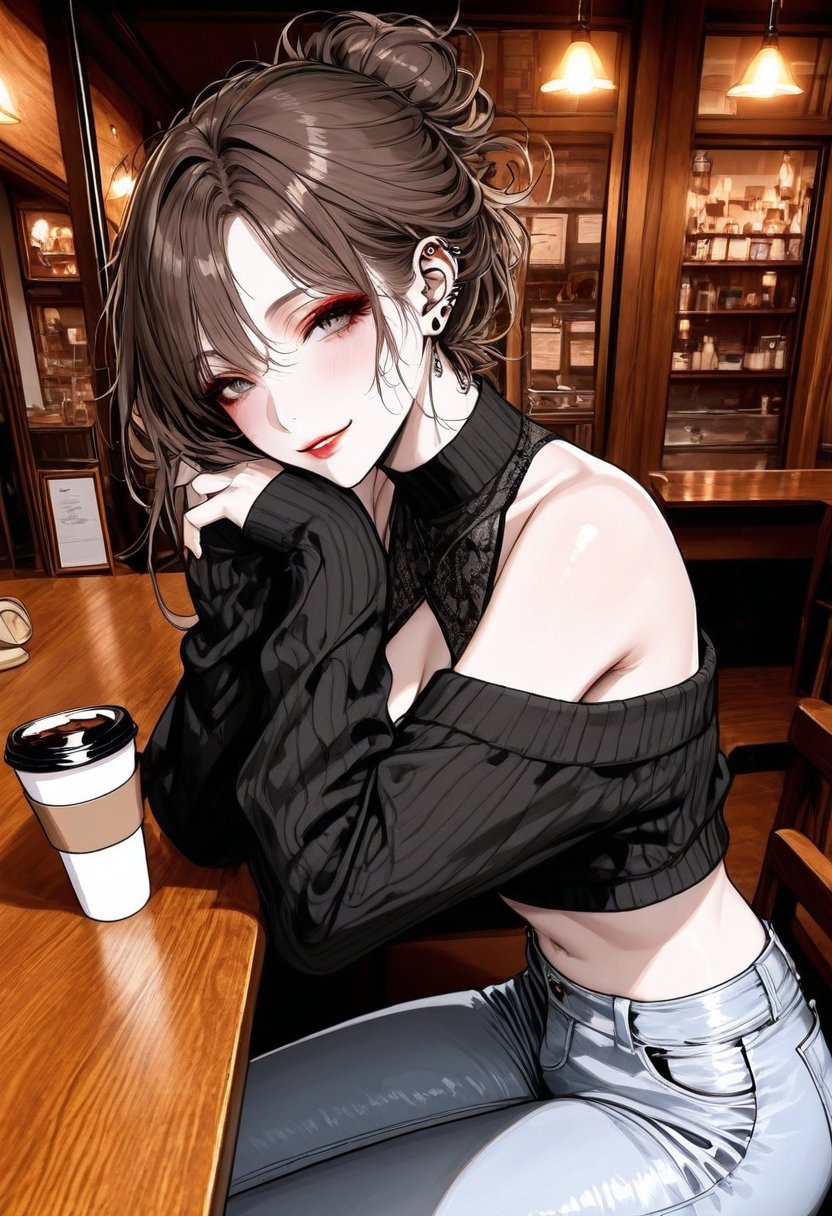She leans against the counter, sipping on a latte, her oversized sweater slipping off one shoulder, revealing a hint of black lace underneath.