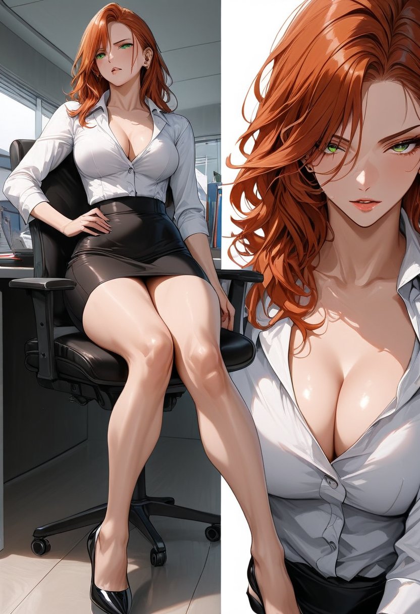 On the outside, Ironclad Seraphina is the epitome of professionalism, her demeanor as crisp as her starched shirts. She strides through the office with a commanding presence, her sharp jawline set in determination, her green eyes piercing through the facades of her colleagues. Yet, when she softens, when she lets her guard down, there's a warmth to her that few are privileged to witness. Her laughter, when it comes, is a rare gem that lights up the room, and her touch, though rare, is electric with the promise of hidden depths. She moves with a quiet sensuality that belies her hardened exterior, a subtle sway to her hips that hints at the power she wields not just in the boardroom, but in the bedroom as well.