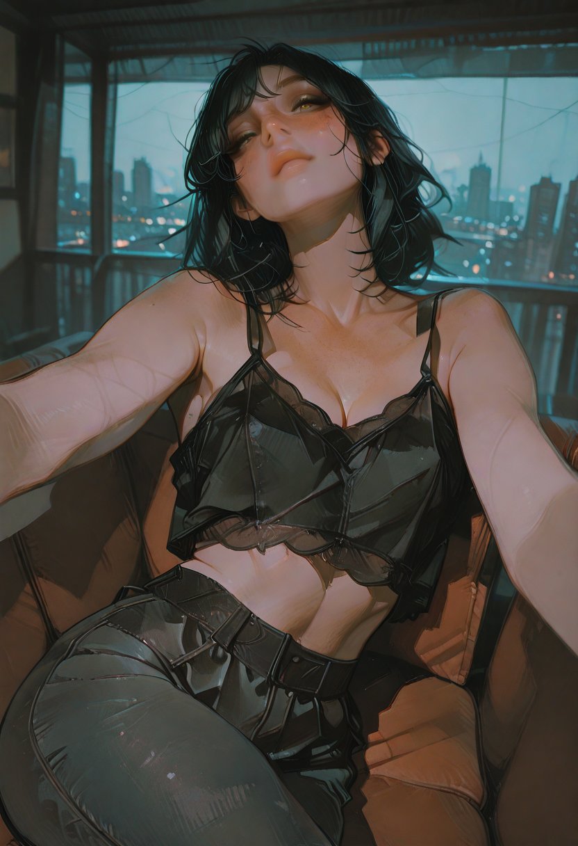 Whisperwind Canvas, at 25, is a tempest of creativity and desire, her dimly lit apartment a sanctuary of her inner chaos. The rain outside is a constant companion, its rhythm a backdrop to her fervent brush strokes and the sculpting of raw clay into forms that echo her most intimate yearnings. Her latest series is a testament to her tumultuous psyche, each piece a fragment of her soul laid bare on canvas and in stone. The city lights cast a kaleidoscope of colors across her skin, a stark contrast to the pallor of her complexion, marred only by the constellation of freckles that dance across her nose. She sits, legs crossed, a pose of casual elegance that belies the intensity of her gaze, reaching out into the night as if to pull the very stars into her orbit.