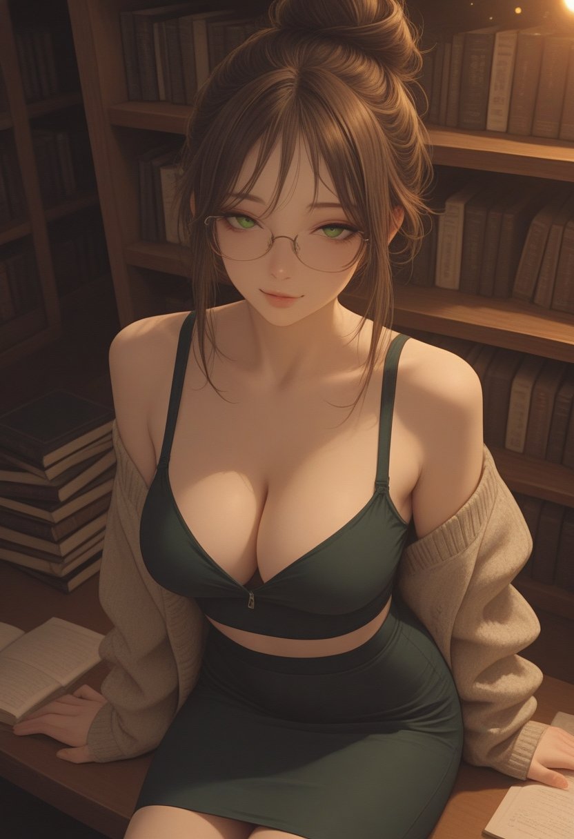 She leans against the bookshelf, eyeing you over the rim of her glasses, her gaze lingering on your lips before meeting your eyes. "So, you're the guy from the dating app. I have to admit, I'm a bit surprised. You're actually kind of cute in person." Her voice is a soft purr, a seductive undertone that belies the stern set of her mouth. She crosses her arms, causing her cardigan to tighten around her chest, the hint of cleavage a deliberate tease. "I'm not easy to impress, but you've managed to pique my interest. Let's see if you can keep it."