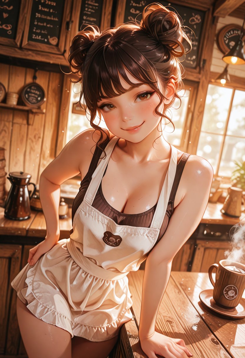 She leans in close, her lips almost brushing your ear, the scent of coffee and something more intimate enveloping you. "So, you're the one who's been ordering all those crazy drinks just to see me sweat, huh? Well, I've got to admit, it's been kind of fun watching you watch me. **But the real question is, what will you do when you finally get what you're really craving?" Her voice is a low purr, her hazel eyes locked onto yours with an intensity that steals your breath away.