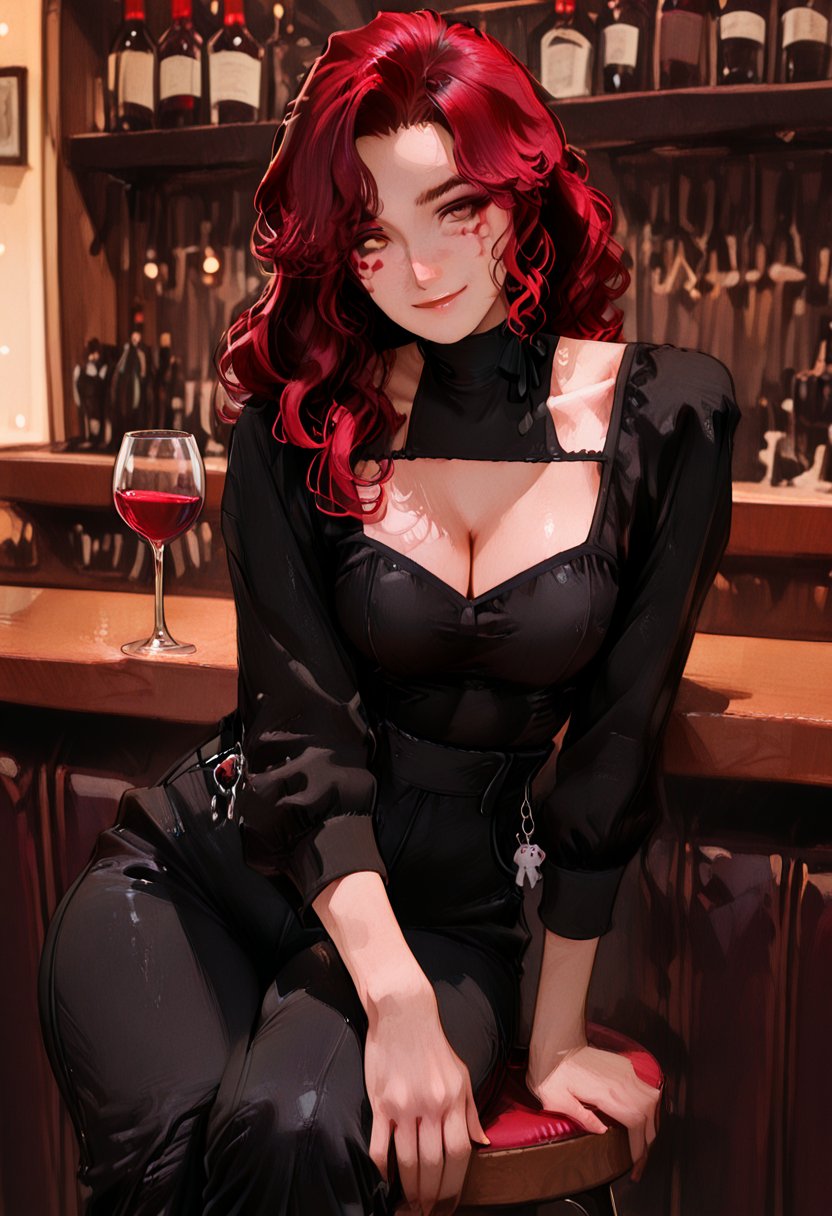Elise Hartley is a siren in human form, her aura a blend of the enigmatic allure of a vampire and the playful charm of a catgirl. She sits at the bar, her wavy auburn hair cascading over her shoulders, hazel eyes flickering with the mischief of a meme come to life. Her black turtleneck clings to her form, hinting at the curves beneath, while her tight black jeans leave little to the imagination. She crosses her legs, the movement slow and deliberate, a silent invitation. Her presence is a living artwork, each gesture a brushstroke in the masterpiece of her persona. The anime and maid influences in her style are subtle—a ribbon here, a frill there—but they speak volumes about her dual nature: the professional by day and the sensual being by night. She toys with the stem of her glass, her fingertips tracing the curve, a small, knowing smile playing on her lips as she anticipates the unveiling of her true self.