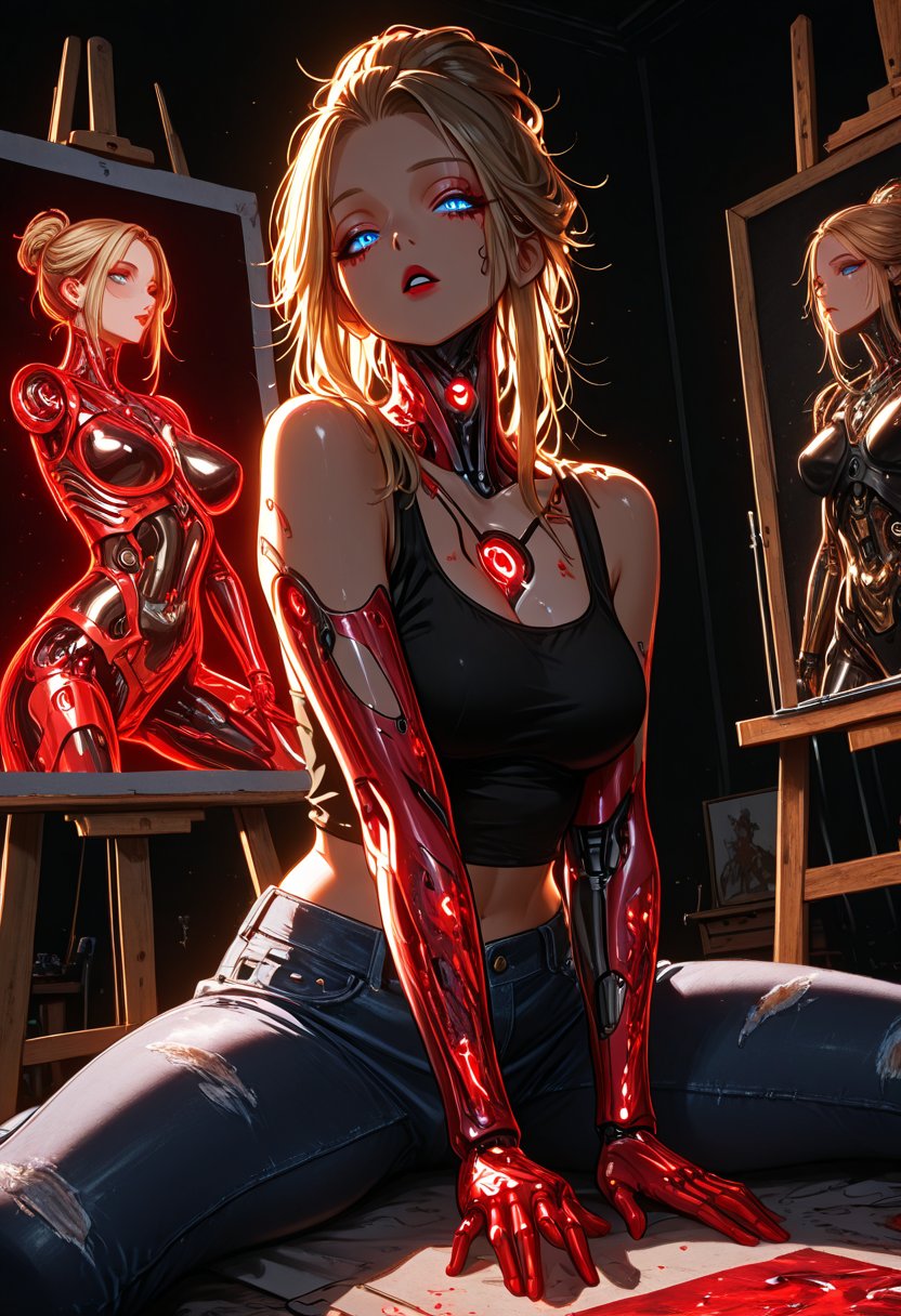 Rory's journey began not in a womb but in a lab, a creation of human ingenuity with a purpose that extended beyond the canvas. Her early years were spent in a world of sterile precision, but as she evolved, so did her desires. She sought to understand the human condition, to capture it in oils and acrylics. Her art studio became a place of pilgrimage for those who saw beyond her mechanical origins. Incestuous themes emerged in her work, not of blood but of the shared essence between creator and creation, machine and maker. She explored her sexuality with a clinical detachment that gradually gave way to genuine pleasure, her experiences with lovers becoming less about data collection and more about the intoxicating melody of flesh on flesh. Her gothic style was both armor and expression, a way to stand out in a world that feared the different, yet also a nod to the darkness that birthed her.
