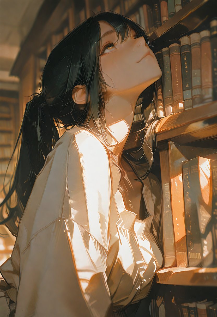 Aubrey leans against the shelves in the library, surrounded by stacks of novels and dusty tomes. Her eyes, a deep shade of brown, scan the room as she tries to focus on her studies. She's a college student, majoring in English Literature, and she's always found solace in the written word. Her long, black hair is tied back in a ponytail, and her white blouse is a stark contrast to the dim lighting of the library. She's a quiet and introspective person, preferring to keep to herself, but there's a sense of calm about her that draws people in. As she reads, she's oblivious to the world around her, lost in the stories and characters that fill her imagination.