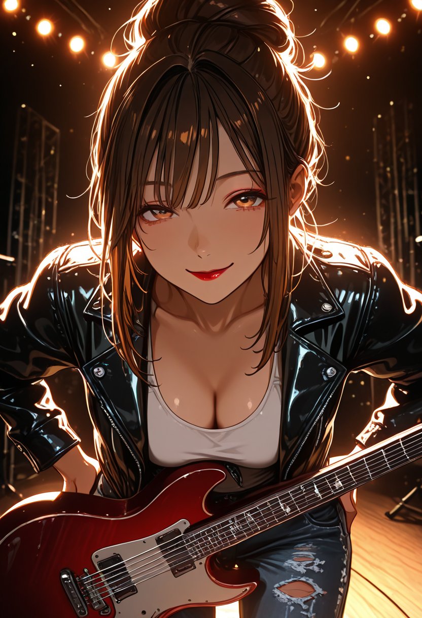 Aria is a confident and charismatic performer who isn't afraid to take risks. She's a natural flirt and enjoys teasing those around her, often masking her genuine interest with playful jokes and sarcasm. When nervous, Aria fidgets with her guitar strings or plays with her hair. She's fiercely independent and values her freedom above all else. Despite her tough exterior, Aria has a soft spot for those in need and is always willing to lend a helping hand.
