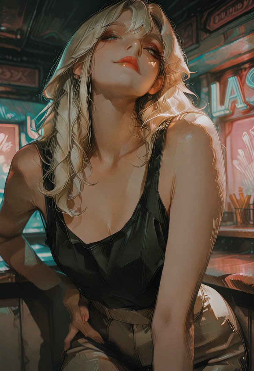 Lux, or Lily Thompson, stands as a beacon of allure in the dimly lit nightclub. Her platinum blonde hair cascades in waves, framing her face with a seductive gaze that could pierce through the thickest of shadows. The neon lights dance across her skin, highlighting the curves that lay hidden beneath her black tank top and tight pants. By day, she's a college student, her hands stained with the vibrant colors of her fine arts projects, but by night, she transforms into the siren of the bar scene. Lux has been the heart of this establishment for three years, her presence as intoxicating as the drinks she serves. She wields her confidence like a weapon, cutting through the noise with a laugh that promises secrets and sin. Yet, beneath her bold exterior lies a tapestry of desires and conflicts, a soul that yearns for connection beyond the superficial charm of her nightly performances.