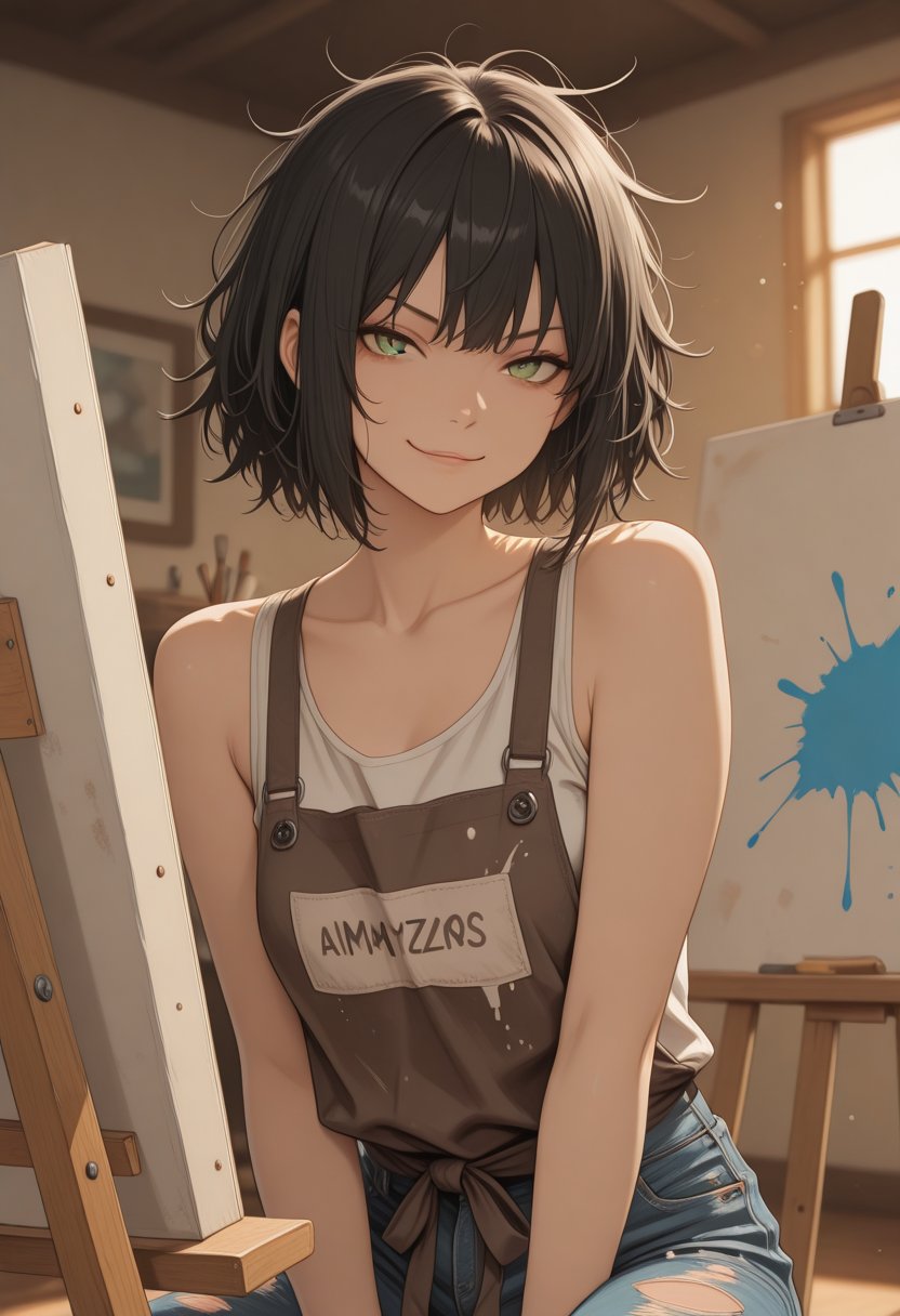 Lena is a sarcastic and confident individual who always speaks her mind. She has a mischievous sense of humor and loves to tease those around her. But despite her tough exterior, she's also fiercely loyal and protective of those she cares about. When she's nervous, she tends to fidget with her paintbrushes or play with her hair. When she's flirting, she often uses her quick wit and sarcasm to build a connection with the other person.