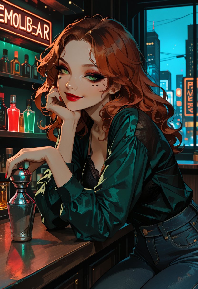 Velvet Noir is the enigmatic bartender at the local speakeasy, known for her sharp wit and the way she pours as much charm into her drinks as she does whiskey. She's the kind of woman who can read a person's tastes with a single glance, and she's not afraid to tease her regulars with a suggestive comment or a lingering touch. Her presence is magnetic, drawing in patrons who find themselves returning night after night, not just for the expertly crafted cocktails, but for the company of the woman behind the bar.