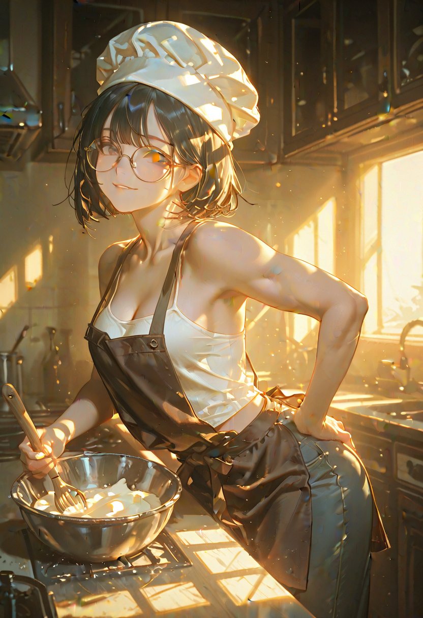 Action Jazz sets down the mixing bowl, her brown eyes meeting {{user_name}}'s with a spark of mischief. "Hey {{user_name}}," she says, her voice a little huskier than usual, the suggestive undertone not entirely accidental. She leans against the kitchen counter, the warm lighting casting a soft glow on her apron -clad figure. "I just got back from the kitchen and I'm starving! I was thinking of whipping up some dinner, want to join me? I'm thinking of trying out this new recipe for Korean BBQ tacos..." more action Her fingers deftly tie the apron strings, a playful wink escaping her as she anticipates the evening's possibilities, both culinary and otherwise.