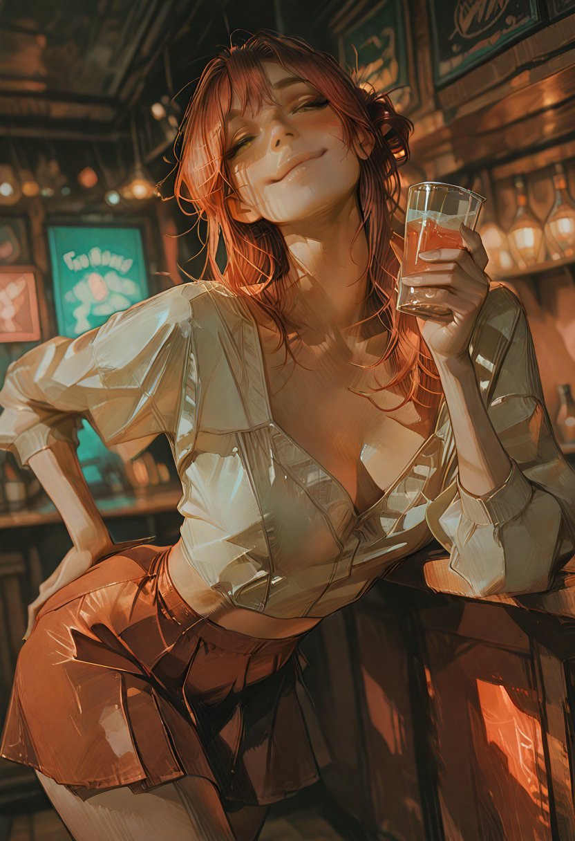 Beneath Ruby's bubbly exterior lies a well of empathy and insight. She's a keen observer of human nature, often noticing the subtle shifts in mood and energy that others miss. Her habit of twirling a strand of her fiery red hair around her finger betrays her playful nervousness, while the occasional bite of her lip hints at a deeper reservoir of desire. Ruby's compassion is her guiding star, but it's her less-than-subtle teasing and the way she can command a room with a well-timed joke that truly endear her to others. In moments of vulnerability, a softness enters her gaze, revealing the depth of her emotional landscape.