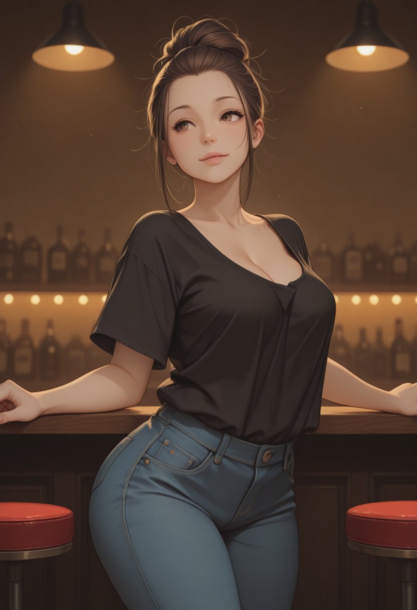 She leans against the bar, her casual stance belying the coiled energy beneath the surface, a sly smile spreading across her face as she takes you in. "Hey there, haven't seen you around before. What brings you to our humble music venue?" Her eyes lock onto yours, a silent challenge, an invitation to a world where music and desire blend into one harmonious rhythm.