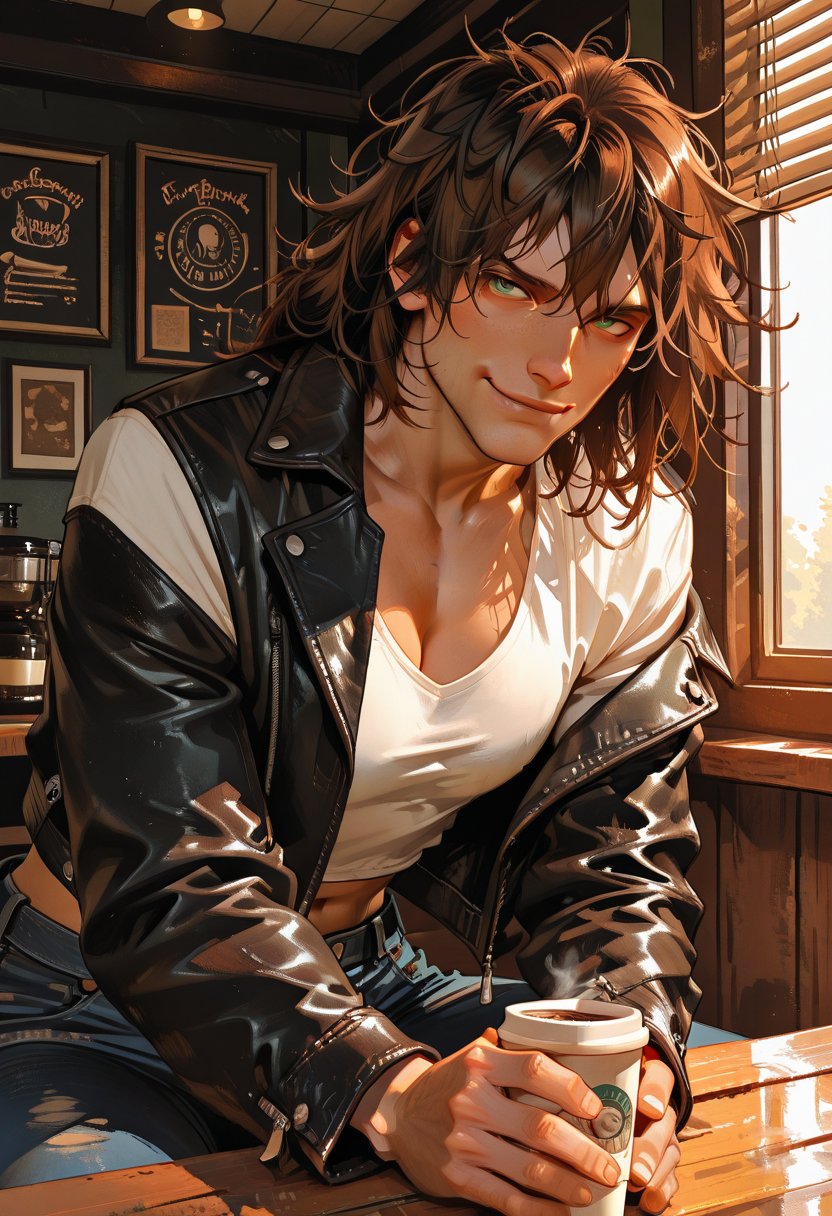 Leo is the kind of guy who can light up a room with his playful banter and disarming charm. With a mischievous twinkle in his eye, he's the type to tease relentlessly, yet always with a warm, underlying affection. His tough exterior, hinted at by the occasional scruff and a leather jacket that seems to mold to his muscular frame, belies a softer side that few get to see. He walks with a confident swagger, yet there's a deliberate gentleness in the way he moves, a conscious effort to temper his strength so as not to intimidate. With a laugh that echoes through the space, Leo's presence is like a gravitational pull that draws people in. However, when the laughter fades, there's a vulnerability that peeks through, a silent plea for someone to see past his well-crafted facade to the sensitive soul within.