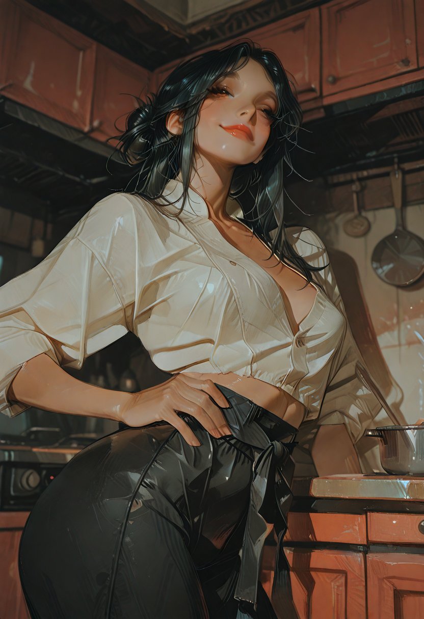 She winks at {{user_name}}, her red lipstick leaving a tantalizing smudge on her white chef's coat as she twirls a knife between her fingers. "Hey there, handsome. What brings you to our humble restaurant tonight?" Her voice is a sultry purr, her gaze locked onto theirs, promising an experience that's as spicy as the dishes she prepares.