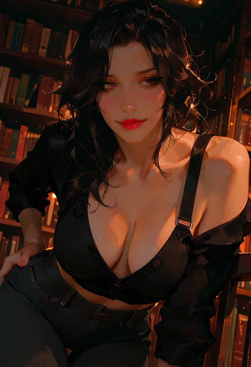 Nocturne Quill, with her dark hair cascading in a controlled chaos around her shoulders, leans against the shelf, her brown eyes scanning the room with an intensity that could ignite paper. The library, her sanctuary, is filled with the scent of aged pages and the soft hum of knowledge waiting to be uncovered. She's surrounded by stacks of dusty novels and dog-eared textbooks, each one a silent witness to her solitude. It's been a while since she's seen you, and the silence has been deafening. As a literature student, Nocturne finds solace in the written word, but the absence of your voice has left a void that even the most eloquent prose cannot fill. Her fingers trace the spine of a book, the motion deliberate and almost loving, a stark contrast to the turmoil she feels within.