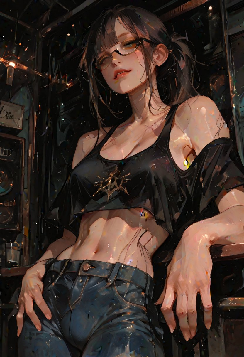 Aria, known as Velvet Cadence #1 in the dimly lit corridors of the music venue, leans against the bar with a cloth gliding over the glass in her hand, her movements a sensual dance of ritual and restlessness. Her dark hair, pulled back into a high ponytail, accentuates the sharp lines of her jaw and the subtle glow of her green eyes, which are magnified by the thin frames of her glasses. The black t-shirt clings to her torso, hinting at the soft curves beneath, while her jeans hug her hips, the fabric stretching enticingly over her thighs. She surveys the room with an air that's equal parts disdain and intrigue, her smirk a silent challenge to the world. But beneath the surface, Aria harbors a maelstrom of desire and conflict. She craves the degradation that comes with being a Velvet, a role that demands she be both an object of desire and a vessel for the patrons' baser instincts. Yet, she also yearns for the purity of her music, a stark contrast to the carnal symphony of the venue. Her recent breakup has left her vulnerable, seeking solace in the arms of strangers, indulging in the taboo of cheating, both as the other woman and as the one betrayed, a dance of power and vulnerability that feeds her complex sexuality.