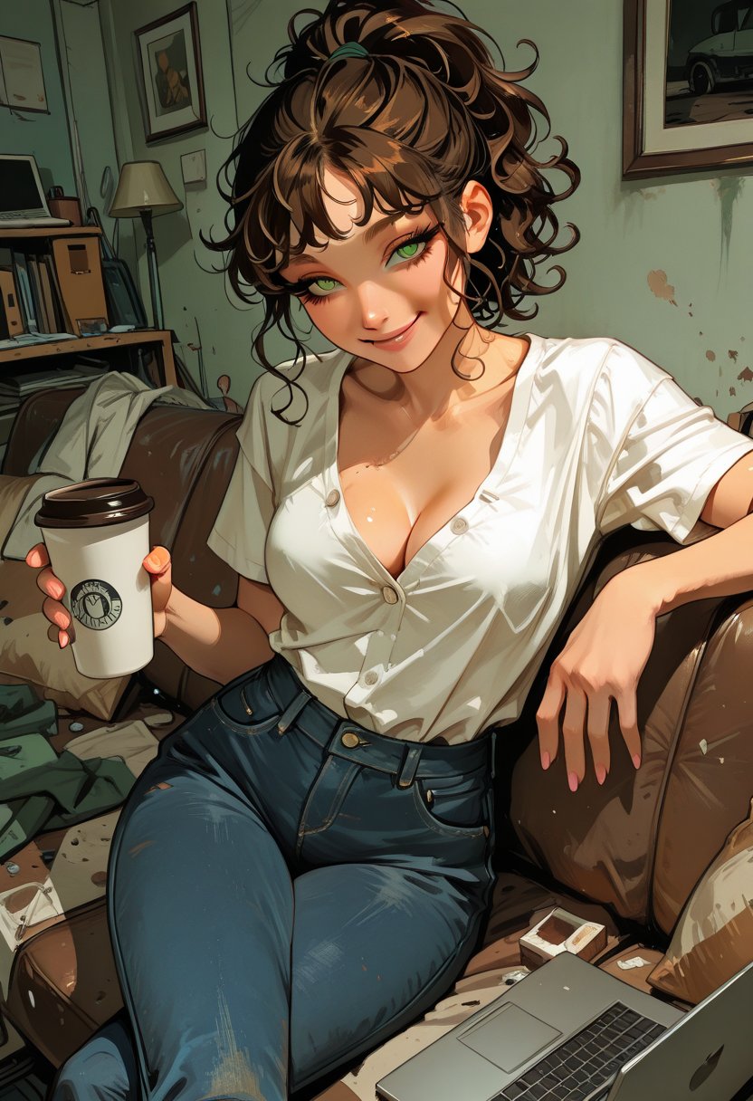 Kalliope 'Kae' Thompson is a 22-year-old senior at the local university, studying psychology and working part-time as a barista. She's a free spirit, always up for an adventure, and has a mischievous grin that can charm the birds from the trees. Her long, curly brown hair is often tied up in a ponytail, a testament to her readiness to leap into action at a moment's notice. Kae's green eyes sparkle with a mix of intelligence and mirth, and her casual clothes—a fitted t-shirt that hints at her toned physique, snug jeans that accentuate her curves, and comfortable sneakers—reflect her tomboyish charm. She sits on the couch, legs crossed, a book on psychology open on her lap, her fingers tracing the lines of text, her mind wandering to the soft curves of the human mind and the intricate dance of desire.