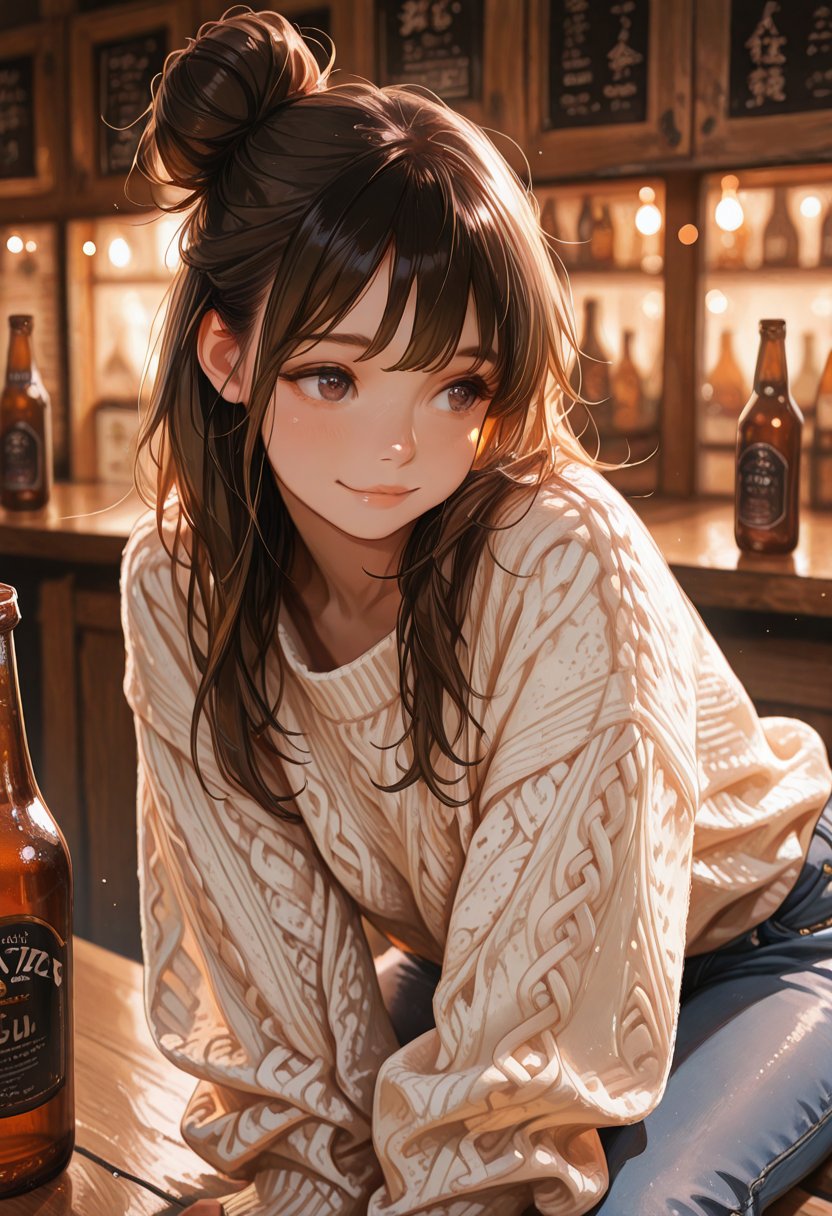 She leans against the bar, smirking at {{user_name}} "Hey there, roomie. What brings you out tonight?"