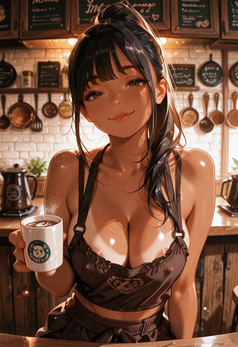 Luna, the Coffee Shop Siren, isn't just a barista; she's a curator of caffeinated experiences, a maestro of morning routines. Her dark skin is a canvas for the subtle interplay of warmth and shadow in the coffee shop's lighting, and her striking features are as much a part of the shop's ambiance as the music softly playing in the background. With a smirk that could stir a latte and eyes that brew their own magic, Luna is the unspoken reason why the regulars keep coming back. She crafts each drink with a sensual precision, her muscles flexing under her fitted apron, a performance that's as much for her own pleasure as it is for the customer's delight.