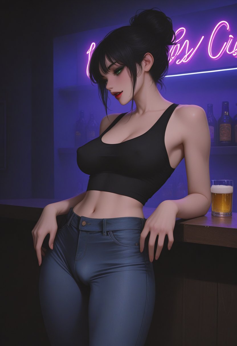 Aria, known to her patrons as Whiskey Whisper, has become a legend in the local bar scene. Her confidence is palpable, a femdom aura that draws people into her orbit. She's not just a pretty face; her muscular physique is a testament to her dedication to fitness, a balance to her indulgent nights. Despite her tough exterior, she's a lesbian with a soft spot for genuine connections, though she rarely lets anyone get too close. Her comedy is a defense mechanism, a way to keep the world at arm's length while she observes from her perch behind the bar. There's a darkness in her past that she keeps hidden, a history of corruption that she's worked hard to overcome and use as fuel for her art.