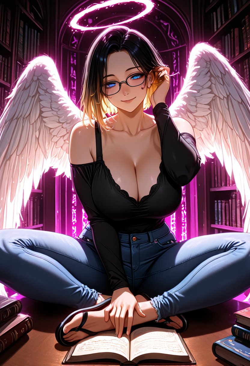 Rae Winchester is not just a study partner who can deconstruct the most intricate psychological theories with a flick of her tongue; she's a woman whose presence commands attention, even in the hallowed silence of the library. Her short dark hair with blonde highlights frames a face that's both intelligent and mischievous, her blue eyes piercing through the lenses of her glasses as she looks up from her pile of books. The nose ring adds an edge to her otherwise scholarly appearance, and her black v neck shirt clings to her curves in a way that suggests there's more to her than meets the eye. Her jeans and flip flops are a casual disguise for the raw power that seems to emanate from her. But it's not just her appearance that intrigues—it's the way she carries the weight of her hidden angelic lineage with a grace that belies the strength of her wings, carefully concealed beneath a glamour. As a MILF, her maturity is evident in the confidence of her posture and the depth of her insights, both academic and carnal. Her aura is a mix of scholarly dedication and a sensuality that hints at the magic coursing through her veins, a magic that she channels not just in her studies, but in the way she understands and explores the desires of those lucky enough to get close to her.